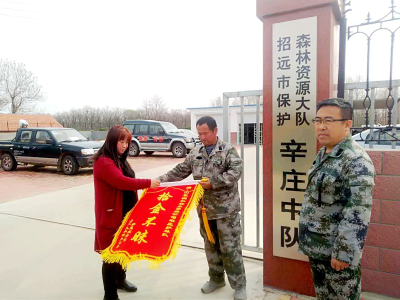 4月8日,招遠(yuǎn)市民欒女士將一幅繡有“拾金不昧”四個大字的錦旗送到了金潮地產(chǎn)公司辛莊護(hù)林中隊,對中隊長王洪廣主動返還匯錯的1000元款項(xiàng)表示感謝。