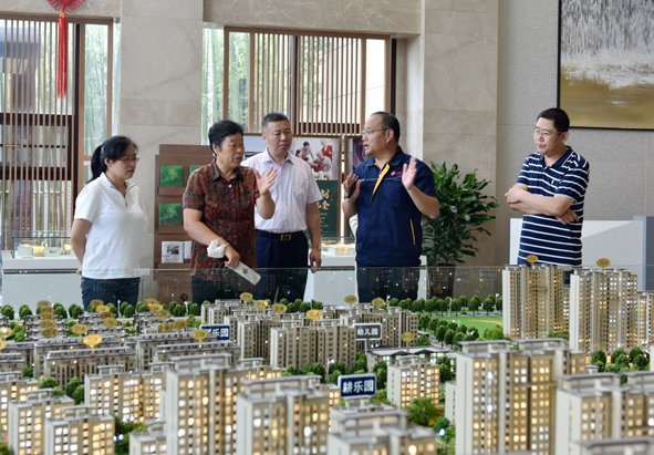 最后,在金潮地產(chǎn)常務(wù)副總經(jīng)理程人光的指引下,調(diào)研組一行又到金潮·格林春天項(xiàng)目營(yíng)銷中心參觀。走進(jìn)營(yíng)銷中心,“摯愛歸家”幾個(gè)字讓人即刻感受到金潮溫暖的家文化。程人光介紹說:“格林春天項(xiàng)目是金潮地產(chǎn)開發(fā)的第五個(gè)項(xiàng)目,也是招遠(yuǎn)市的重點(diǎn)棚改項(xiàng)目。為了讓市民享受到歸家的溫暖,公司不惜重金誠(chéng)邀上海同濟(jì)大學(xué)設(shè)計(jì)團(tuán)隊(duì)打造,分為‘琴、棋、書、耕、家’5個(gè)社區(qū),并設(shè)有符合青年人個(gè)性特點(diǎn)的住宅時(shí)尚區(qū),也有重點(diǎn)規(guī)劃的養(yǎng)老住宅、老年人日間照料中心等養(yǎng)老設(shè)施來滿足老年人頤養(yǎng)和康復(fù)等需求,達(dá)到老有所養(yǎng)、青有所為,秉承‘一生之城’理念,引領(lǐng)招遠(yuǎn)市棚戶區(qū)改造的居住新風(fēng)尚,樹立招遠(yuǎn)市棚戶區(qū)改造的新標(biāo)桿?!?
