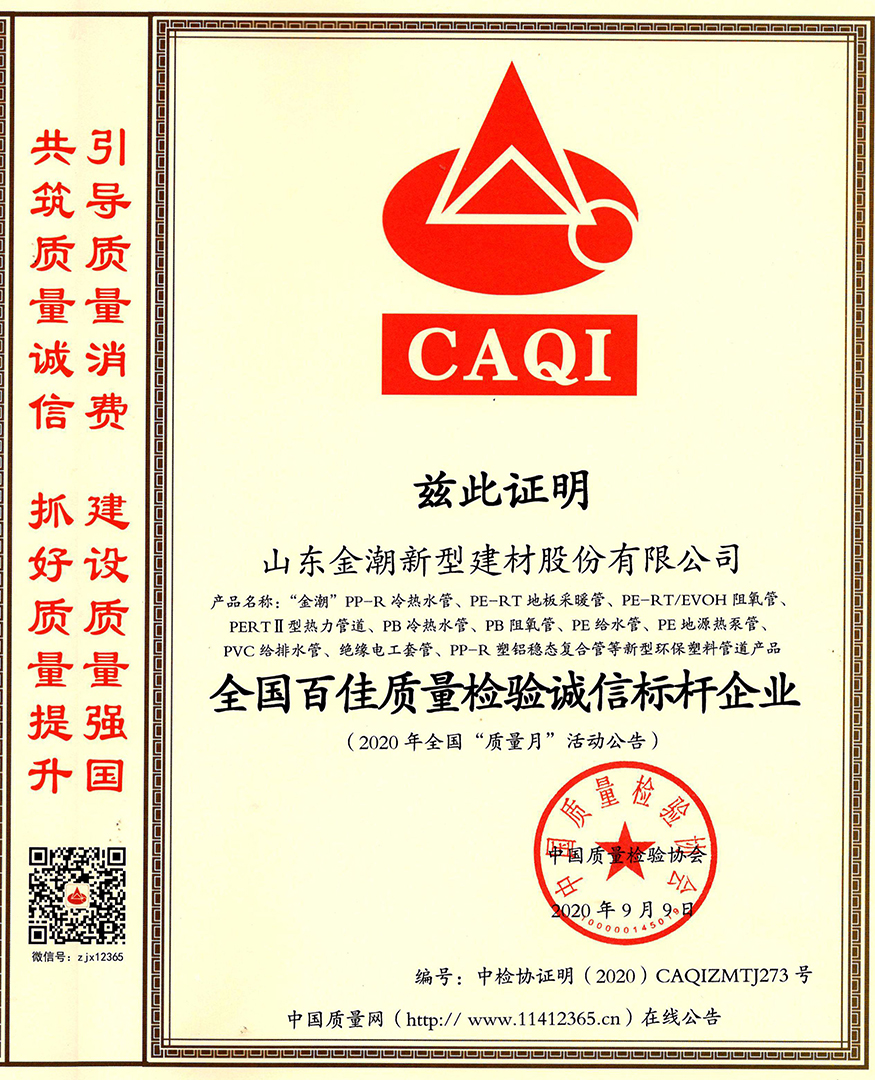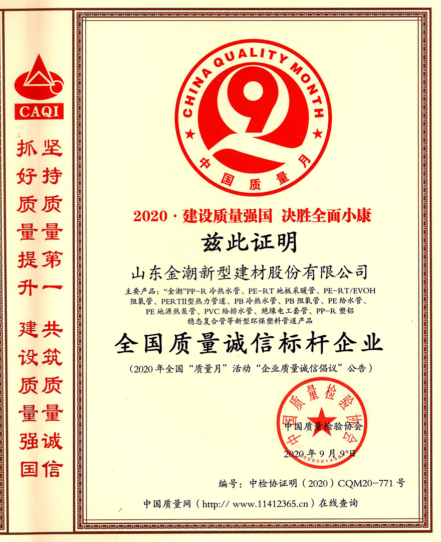 2020年9月,國家市場監(jiān)管總局聯(lián)合中共中央宣傳部、國家發(fā)展改革委等16個部門,共同開展以“建設(shè)質(zhì)量強國 決勝全面小康”為主題的2020年全國“質(zhì)量月”活動。國家市場監(jiān)督管理總局主管的中國質(zhì)量檢驗協(xié)會(CAQI)自2004年全國“質(zhì)量月”就開始持續(xù)組織開展“企業(yè)質(zhì)量誠信倡議”專題活動,督促企業(yè)落實質(zhì)量主體責任,樹立質(zhì)量標桿、弘揚質(zhì)量先進,傳遞質(zhì)量信任、引導質(zhì)量消費,共筑質(zhì)量誠信、共創(chuàng)中國質(zhì)量,營造質(zhì)量強國建設(shè)的良好社會氛圍,取得了明顯成效。山東金潮新型建材有限公司積極參與2020年全國“質(zhì)量月”活動,受到了國家市場監(jiān)督管理總局主管的中國質(zhì)量檢驗協(xié)會的關(guān)注和好評。