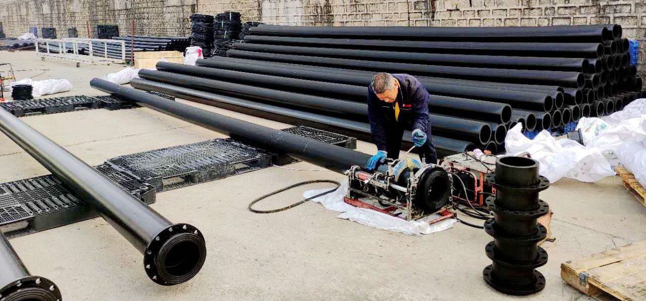 國慶中秋雙節(jié)前夕,金潮新材公司接到招遠市內(nèi)客戶急需規(guī)格為250×18.4 PE給水管660米和225×20.5 PE尾礦管1800米的兩筆訂單,發(fā)貨前需將管道兩端焊接好法蘭連接件。為確保訂單如期供貨,金潮新材公司生產(chǎn)部組織精干力量,放棄假日休息,起早貪黑、加班加點熱熔對接管材。單根225的大口徑管材重達130公斤,需要2人合力搬上對接設備。他們克服對接難度大、要求工藝高、時間緊、任務重等困難,憑著金潮人敬業(yè)的精神、過硬的技術、吃苦耐勞的作風,保質(zhì)保量地按時完成了供貨任務。