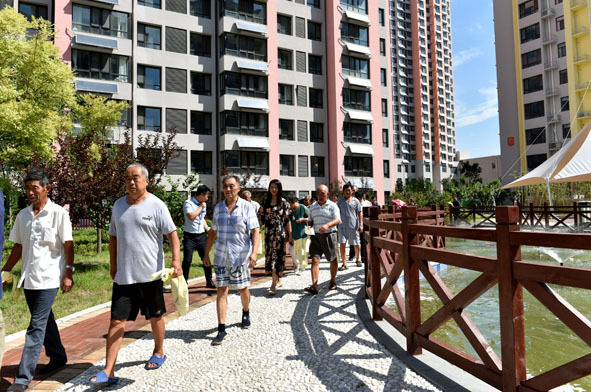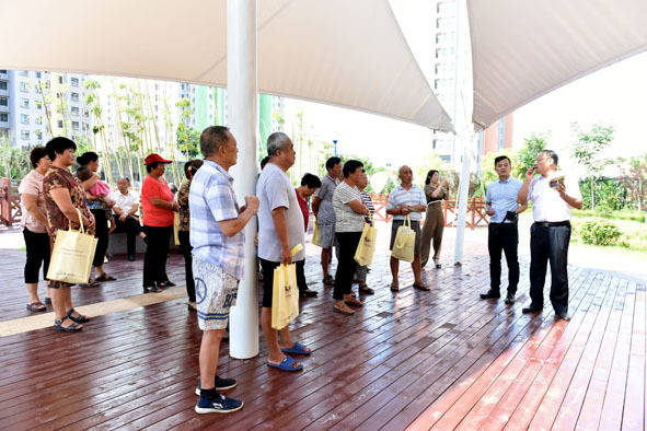8月22日,前幾天的夏雨過后,藍天白云下的金奧國際城綠草如茵,潔白的張拉膜映襯著中心景觀水池中的噴泉,睡蓮花靜靜綻放,抱著孩子的媽媽、推著童車的老人……整個小區(qū)一片祥和安寧。上午9點多鐘,金奧國際城項目迎來了一批特殊的客人,他們是單家村的黨員、村民代表和待拆遷安置的村民。他們來到小區(qū),走在景觀里、大樹下、漫步在木棧道上、水池邊,親身感受著小區(qū)的綠化景觀和他們能夠觸摸到、享受到的美好生活。